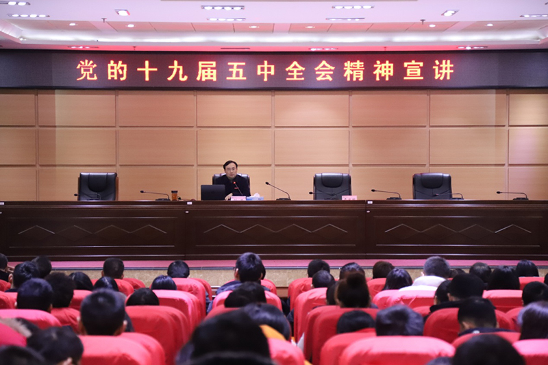 12月16日晚,学校党委副书记、校长刘潜在黄金校区宣讲党的十九届五中全会精神。教师代表200余人到场聆听。