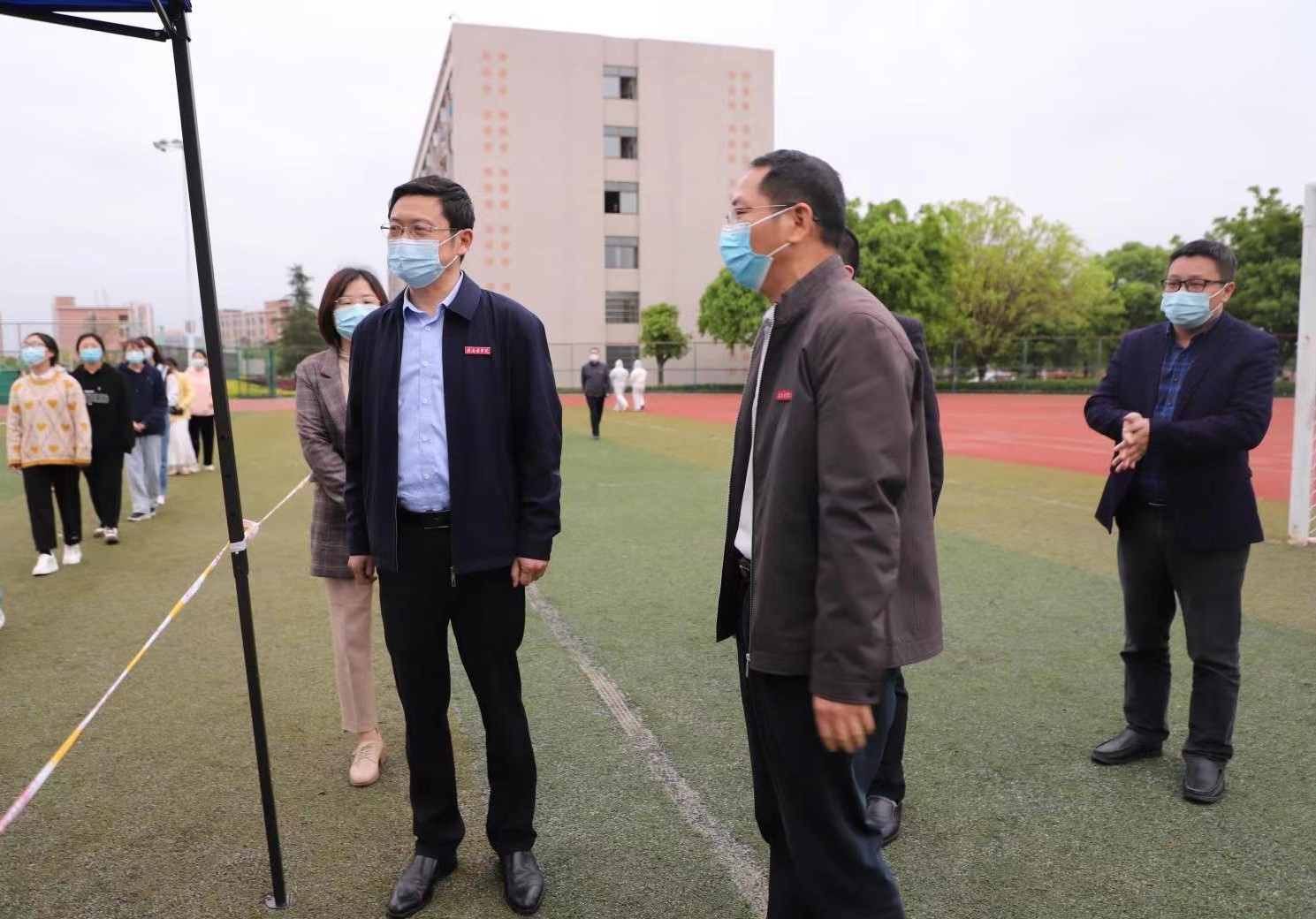 在体育场,张小康实地察看了学校全员核酸检测场地布置、流程安排、人员配备、服务保障、秩序维护、应急措施等具体情况。
